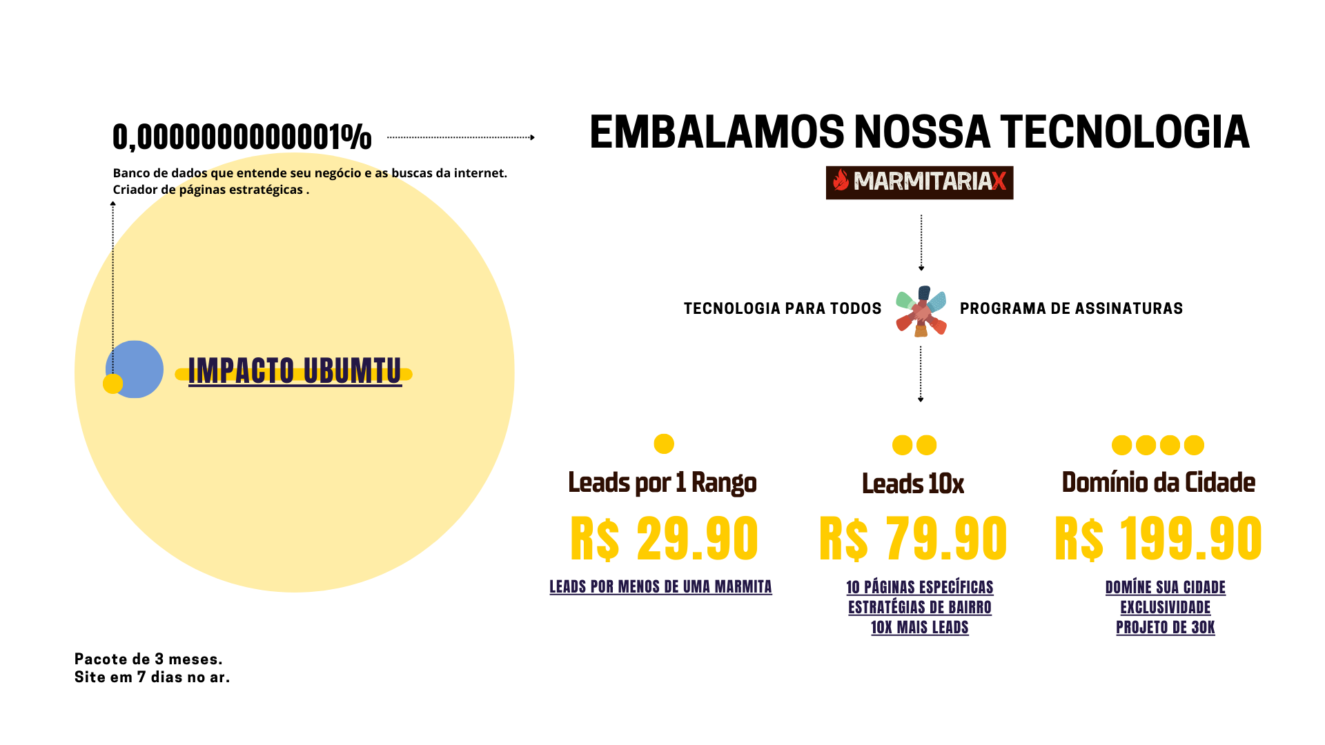 Na Ubumtu Marketing e Tecnologia, acreditamos que o poder da tecnologia deve estar ao alcance de todos, especialmente daqueles que fazem a diferença no dia a dia das pessoas, como os empresários de marmita. Inspirados pela filosofia do Ubuntu, que valoriza a conexão e o crescimento coletivo, criamos um programa de assinatura acessível e pensado para democratizar o acesso a soluções tecnológicas inovadoras.